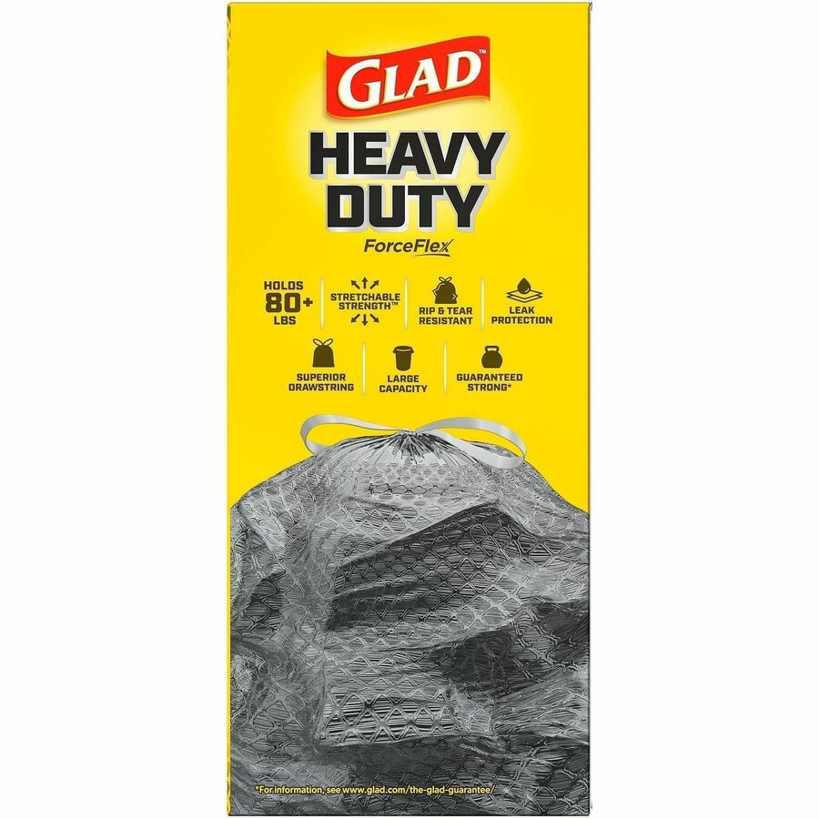 | Marketing Information | Glad ForceFlexPlus Drawstring Bags feature durable strength with a reinforced side seam to let you carry the heaviest loads without tearing the bag. The large-capacity bags fit a 30-gallon can and stretch around your trash with the ForceFlexPlus technology to prevent rips and tears. Built with advanced rip and tear protection, the LeakGuard Protection and RipGuard Protection can withstand even the toughest and messiest trash so what goes in stays in. Strong, reinforcing drawstring closure grips the can and ensures easy closing and lifting with one quick pull. These garbage bags are perfect for tough jobs throughout your home or office, indoor or outdoor. They are ideal for use in schools, daycare centers, restaurants, hotels and other commercial facilities. |